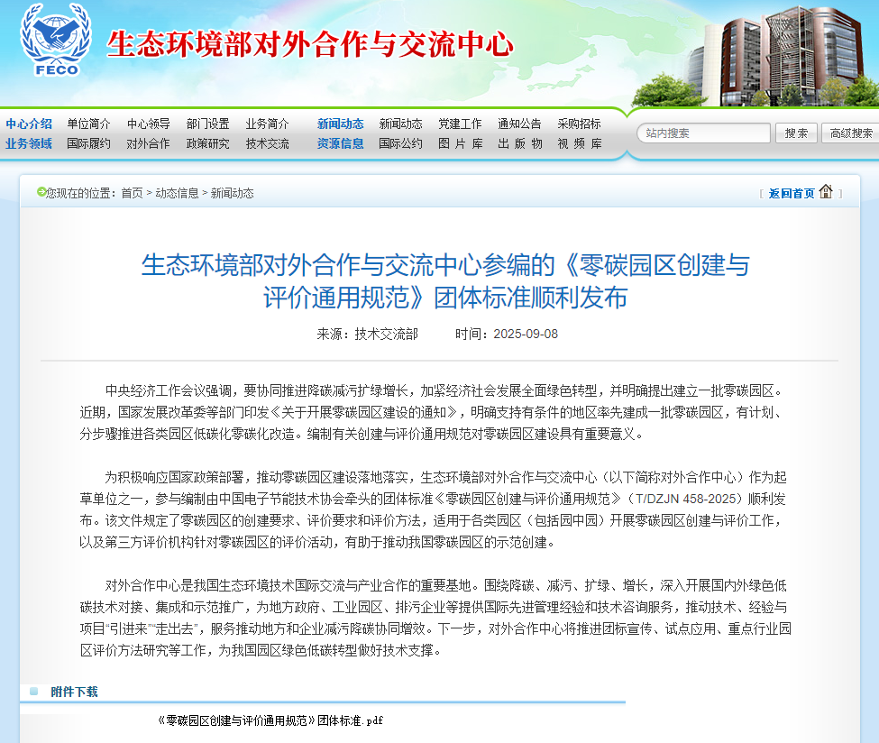 【概要描述】為積極響應(yīng)國家政策部署,推動零碳園區(qū)建設(shè)落地落實,生態(tài)環(huán)境部對外合作與交流中心(以下簡稱對外合作中心)作為起草單位之一,參與編制由中國電子節(jié)能技術(shù)協(xié)會牽頭的團(tuán)體標(biāo)準(zhǔn)《零碳園區(qū)創(chuàng)建與評價通用規(guī)范》(T/DZJN 458-2025)順利發(fā)布。
